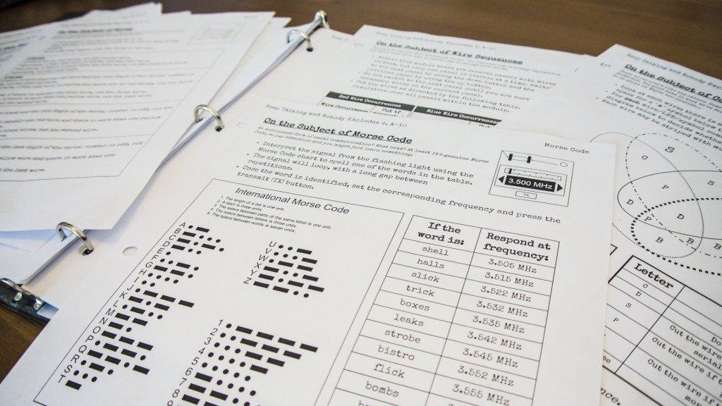 Une fois le jeu lancé, vous vous retrouvez face à une bombe, le chrono tourne, chaque seconde compte… Cette bombe est composée de plusieurs modules à désactiver, chaque fois aléatoirement choisis. Vous aurez besoin d’un partenaire pour éviter la catastrophe. En lui décrivant ce que vous voyez à l’écran, votre coéquipier ira chercher les techniques de désamorçage de chaque module dans le manuel fourni à télécharger sur leur site et à imprimer pour plus de facilités. Devant son manuel, votre partenaire ne doit et n’a pas le droit de voir l’écran… trop facile sinon… Les possibilités de gameplay sont nombreuses : dans la même pièce, par téléphone, via internet…. Et pourquoi pas, pour plus d’immersion, jouer dans le noir à la lampe torche dans deux pièces en communiquant par talkie Walkie pour les plus courageux ? Ce sera à vous d’imaginer vos façons de jouer !