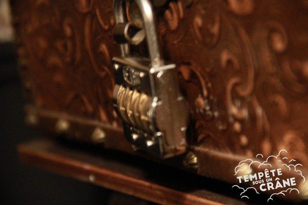 Tempête sous un crâne a pris soin de chercher ses éléments de décor et de jeu. Ainsi nous avons pu voir le cadenas le plus original que nous n’ayons jamais croisé, tout droit venu d’Inde et vous risquer d’y passer un moment ! Durant l’entièreté de la partie le game master interagit avec les joueurs par le biais d’un écran et les indices sont tantôt textuelles tantôt visuels en fonction de la situation.