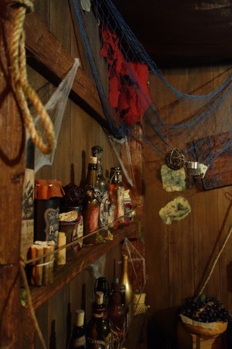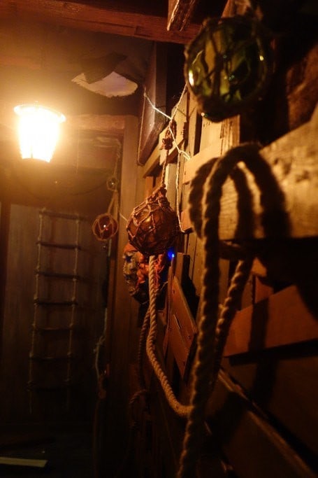 C’est équipé d’un talkie walkie que notre quatuor du jour pénètre dans la salle, entièrement plongée dans le noir. Le texte d’introduction du jeu terminé, la lumière s’allume et nous pouvons découvrir l’espace. L’aventure commence dans la cale du navire, et c’est un décor rappelant fort une célèbre attraction des parcs Disneyland qui s’offre à nous, sauf qu’ici nous ne sommes pas dans un bateau et l’on pourra interagir avec ! Le décor est riche, et fait honneur au thème de la piraterie. Sol, plafond, murs, toute la pièce a été travaillée pour transporter les joueurs ailleurs. Les accessoires sont nombreux. C’est donc entouré de tonneaux, fillets, bouteilles de rhum et autres ballots de marchandises que nous allons évoluer durant la prochaine heure.